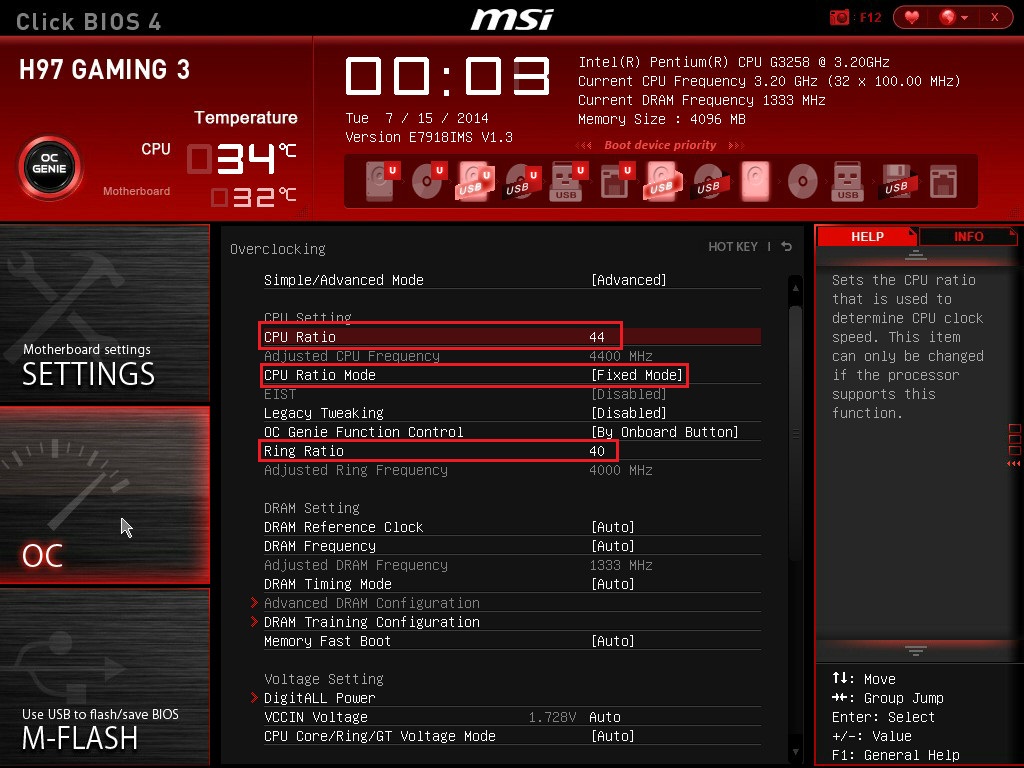 - Ubah CPU Ratio menjadi 44, ini akan membuat kecepatan CPU menjadi 4400 Mhz