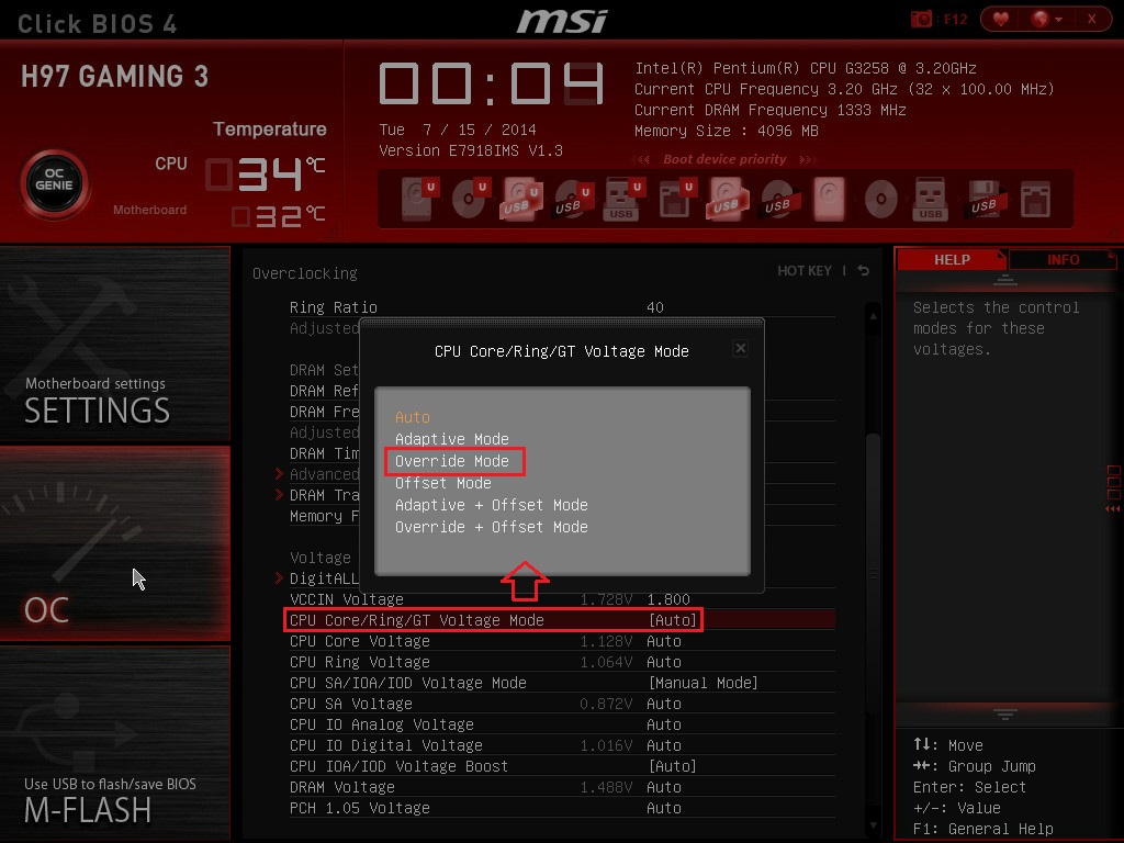 4) Pada bagian Voltase, set CPU Core/Ring/GT Voltage Mode menjadi ‘Override Mode‘, ini akan membuat voltase menjadi ‘fixed’ dan tidak berubah saat idle.