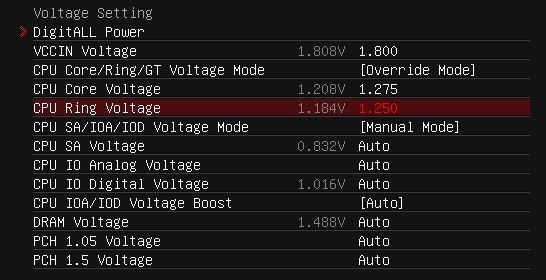 5) Set VCCIN Voltage ke 1.800 V, CPU Core Voltage ke 1.275 V, dan CPU Ring Voltage ke 1.250 V