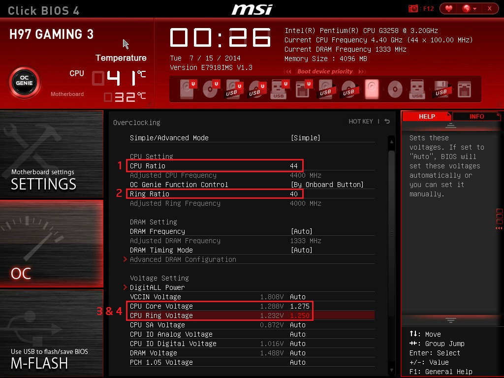 MSI memberikan Simple Mode untuk membantu banyak overclocker pemula. Pada mode ini, tidak banyak parameter yang perlu anda setting. Anda hanya perlu men-setting CPU Ratio, Ring Ratio, CPU Voltage. Berikut langkah-langkahnya: