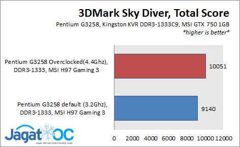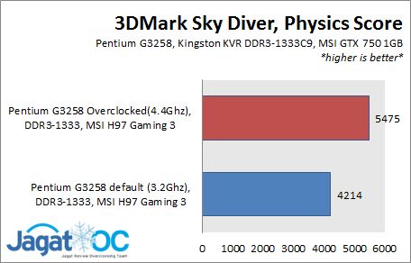 Skor Total 3DMark Sky Diver hanya berubah sedikit setelah overclocking(karena benchmark ini menitik-beratkan performa GPU), namun skor Physics Test dari 3DMark SKy Diver memperlihatkan peningkatan hampir 30%.