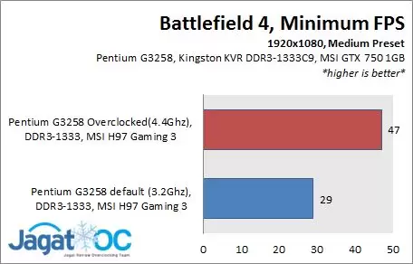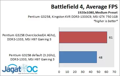 Battlefield 4 sering disebut-sebut sebagai ‘musuh’ gamer yang memiliki prosesor dual-core. Terlihat disini bahwa Pentium G3258 pada keadaan default mendapat tingkat framerate rata-rata 48 FPS, namun seringkali kami mencatat adanya ‘framerate drop’ yang tiba-tiba ke tingkat 28-29 FPS pada scene yang kami mainkan. Yang menarik, setelah overclock ke 4.4Ghz, framerate minimum dari sistem kami meningkat dari nilai 29 FPS ke nilai 47 FPS, dan nilai FPS rata-rata meningkat dari 28 FPS menjadi 60+ FPS. Peningkatan performa hampir 30% berkat overclocking ini tentunya akan memberi pengalaman bermain yang lebih menyenangkan.