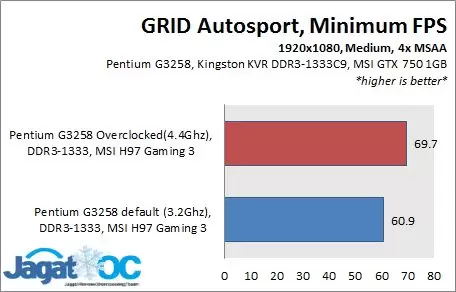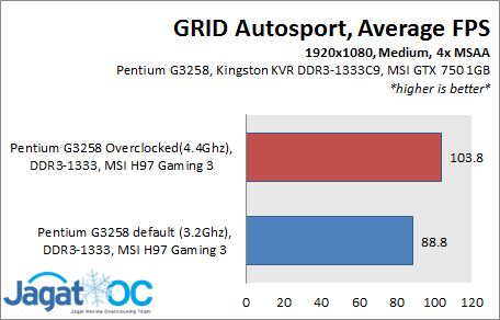 Pada setting Medium, GRID Autosport sudah bisa dijalankan dengan nyaman, minimum FPS-nya bahkan sudah mencapai 60 FPS. Meski demikian sistem yang sudah dioverclock dapat menunjukkan sedikit peningkatan FPS rata-rata dan juga FPS minimum-nya. Untuk para pengguna monitor 120Hz, tentunya peningkatan framerate ini akan berguna. Atau setidaknya untuk menjaga tingkat minimum FPS yang lebih tinggi supaya tidak drop dibawah 60 FPS.