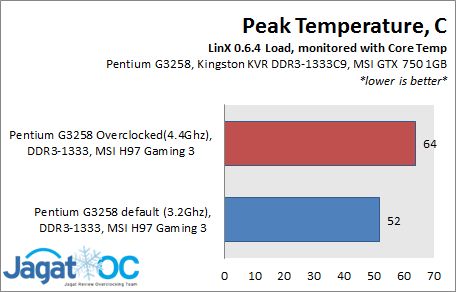 Prosesor G3258 yang dioverclock ke 4400Mhz dengan VCore 1.275V menunjukkan peningkatan suhu sebesar 12 C ketika dioverclock. Dengansuhu maksimum sebesar 64 C, nampaknya masih cukup aman digunakan untuk sehari-hari. Yang lebih menarik adalah heatsink VRM pada motherboard MSI H97 Gaming 3 masih tetap dingin, meski prosesor dioverclock. Ini berarti load yang diberikan prosesor Pentium G3258 tidak terlalu ‘menyiksa’ MOSFET di motherboard, serta MSI Gaming 3 memiliki solusi pendinginan VRM yang memadai.