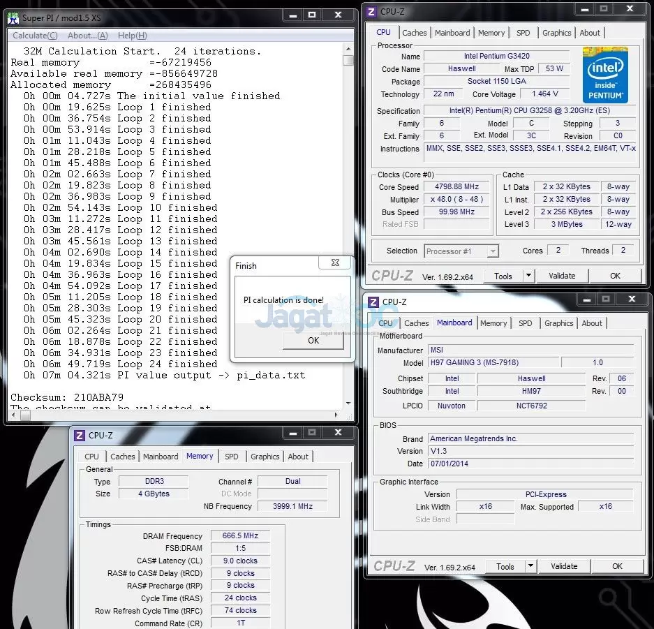 Hasil SuperPi 32M pada 4800Mhz ini tidak terlalu bagus, karena RAM kami hanya berjalan di DDR3-1333Mhz. Bagi para pemburu skor benchmark dan competitive overclocker, nampaknya limitasi tuning RAM pada chipset non-Z akan terasa mengganggu pencapaian skor maksimal.