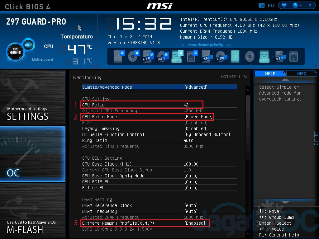 - Masuk tab ‘OC’ pada menu BIOS, Pilih ‘Advanced Mode’, lalu Ganti CPU Ratio ke nilai yang diinginkan(kami menggunakan 40 hingga 42)