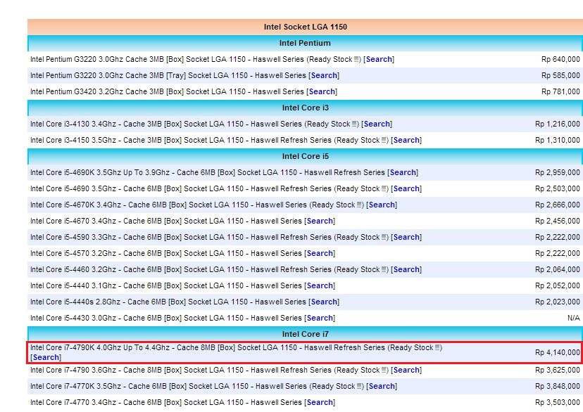 Beberapa hari lalu di beberapa forum diskusi IT Indonesia, beredar kabar bahwa prosesor Intel Core i7-4790K a.k.a “Devil’s Canyon” sudah beredar di pasar komputer Indonesia, setidaknya di Jakarta. Mulai tanggal 17 Juli 2014 kemarin kami juga sudah melihat beberapa toko PC online di Jakarta memasukkan prosesor tersbeut dalam list harga mereka. Berikut ini screenshot dari beberapa toko online tersebut(screenshot dibuat tanggal 18 Juli 2014):