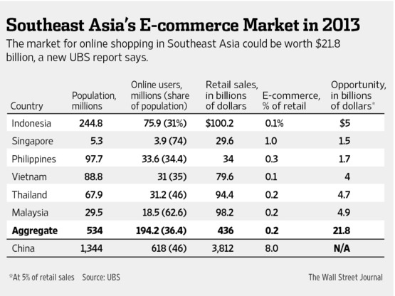 Untuk pasar Indonesia sendiri, memang nilai pasar e-commerce paling tinggi dibanding negara lainnya di Asia Tenggara. Hal ini didukung oleh tingkat populasi penduduk di Indonesia paling banyak. Sayangnya, tingkat adopsi e-commerce di Indonesia masih lah terendah, hanya 0,1 persen. Bandingkan dengan Cina, yang memiliki populasi terbanyak di dunia, tetapi masyarakatnya memiliki minat beli yang tinggi terhadap toko online.