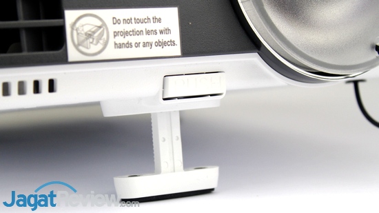 Proyektor ini tidak memiliki mekanisme zoom sehingga pengguna hanya akan mendapatkan ukuran proyeksi statis dari jarak tertentu. Namun, untuk sebuah proyektor short throw yang bisa menghasilkan proyeksi berukuran cukup besar dari jarak dekat, fitur zoom tampaknya memang tidak diperlukan lagi. Berdasarkan pengujian kami, dari jarak 1 meter, proyeksi yang dihasilkan di bidang proyeksi mencapai diagonal 70″ ketika kami menggunakan rasio 16:9 dan 78″ untuk rasio 4:3.