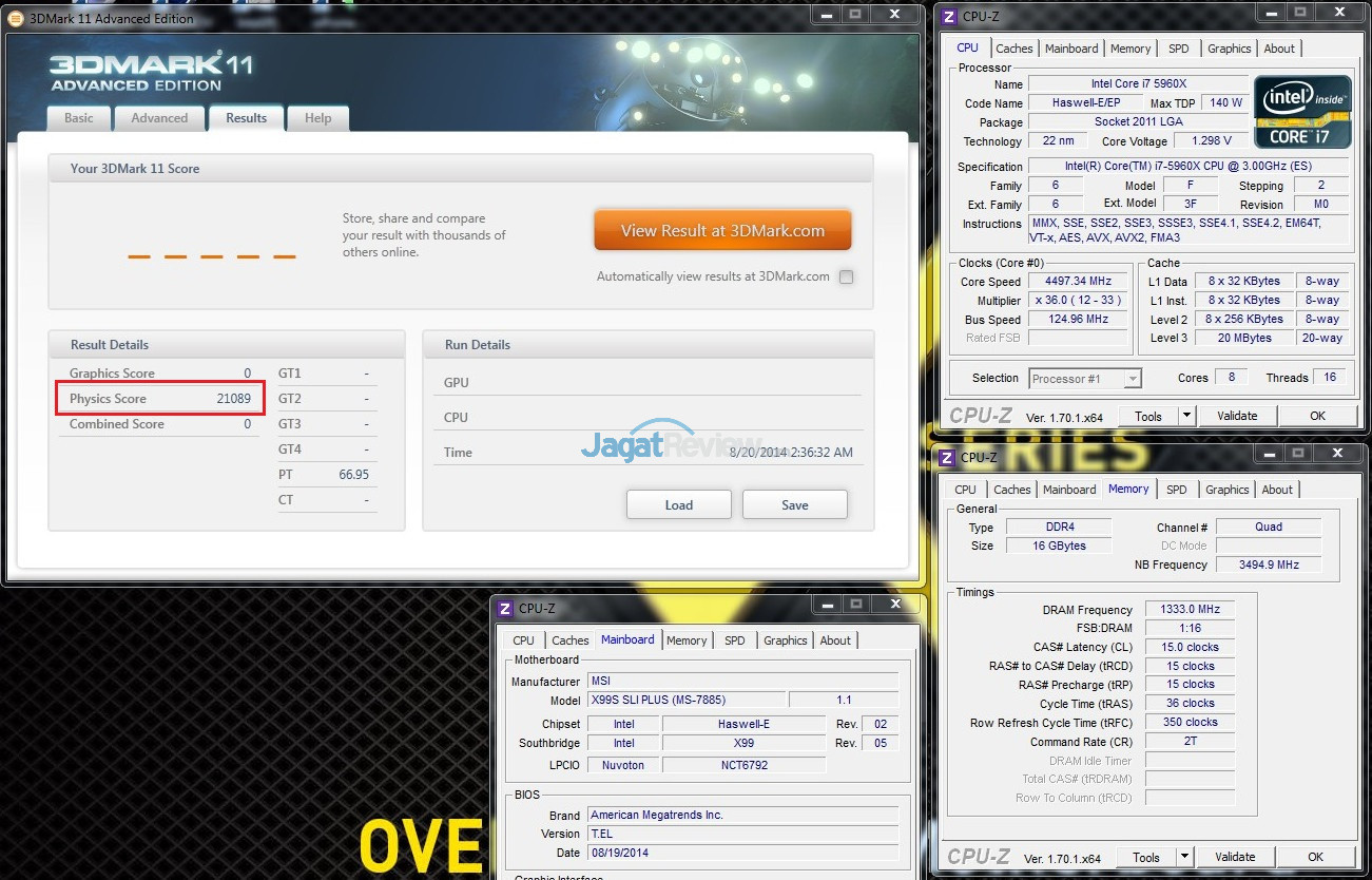 Pencapaian skor benchmark saat prosesor Core i7-5960X di-overclock mengundang decak kagum dari kami. Prosesor tersebut mencatatkan skor Cinebench R11.5, 3DMark11 Physics Score, dan 3DMark Fire Strike Physics Score yang JAUH lebih tinggi dari semua prosesor yang pernah kami uji di lab OC JagatReview. Sebagai perbandingan, anda bisa melihat kembali artikel Extreme Overclocking Core i7-4960X kami di ASUS RIVBE yang terdahulu, dan anda akan menemui bahwa prosesor Core i7-5960X yang berjalan di 4.5Ghz memiliki skor 3DMark 11 Physics yang lebih kencang dari sebuah Core i7-4960X dengan kecepatan 5.6Ghz!