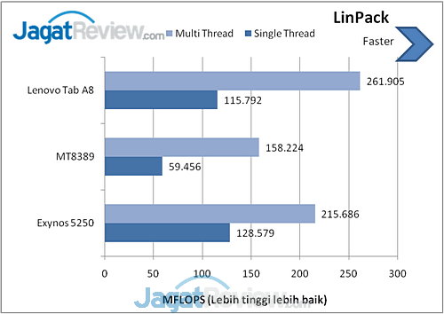 LinPack merupakan benchmark untuk CPU yang digunakan untuk mengukur seberapa cepat perangkat Android Anda. Hasilnya dalam bentuk MFLOPS(Million Floating Point Per Second). Semakin tinggi nilainya, semakin bagus.