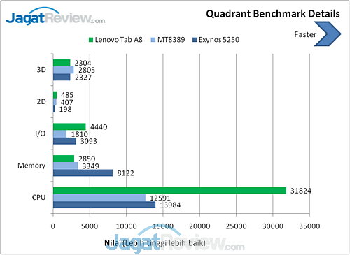 Quadrant adalah benchmark untuk CPU, I/O, dan grafis 3D. Versi yang kami gunakan adalah Standard Edition yang bisa diunduh secara gratis. Semakin tinggi nilai yang dihasilkan benchmark ini, semakin baik.