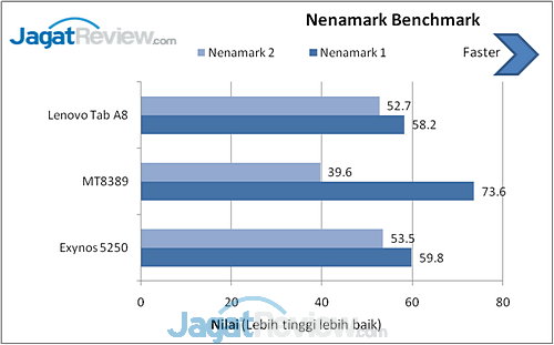 Nenamark adalah benchmark untuk OpenGL ES 2.0. Benchmark ini menampilkan efek grafis yang akan memaksa GPU (Graphic Processor Unit) bekerja secara maksimal. Semakin tinggi nilai yang didapat, semakin bagus.