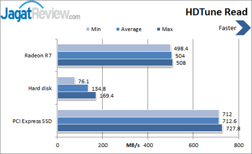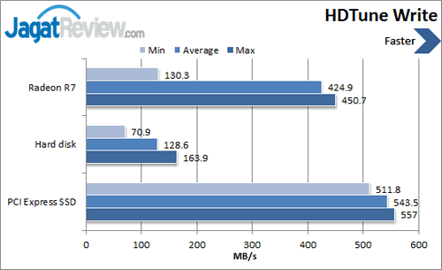 Di pengujian kali ini, JagatReview memakai sebuah hard disk kencang dan PCI Express SSD sebagai pembanding. Tujuannya hanya untuk mengetahui seberapa kencang AMD Radeon R7 dibandingkan dengan dua perangkat storage lainnya.