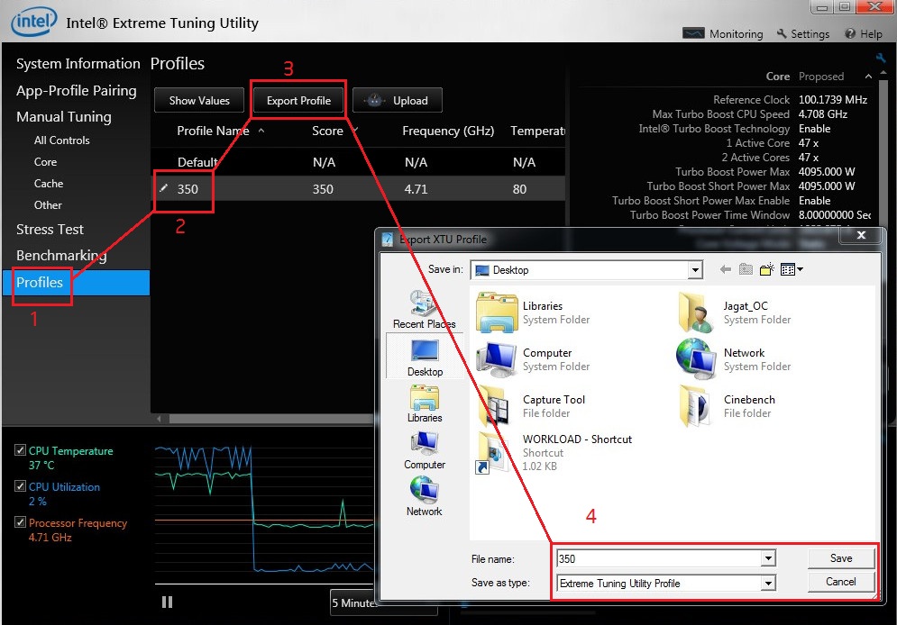 Setelah benchmark selesai, klik ‘Save’ di bagian kanan bawah untuk men-save profile dan juga hasil benchmarknya, tulis nama profile yang diinginkan. Berikutnya masuk ke bagian ‘Profiles’, klik file profile yang dibuat sebelumnya, dan klik ‘Export Profile’ ke tempat yang diinginkan. File hasil export profile ini nantinya yang akan digunakan untuk submit.