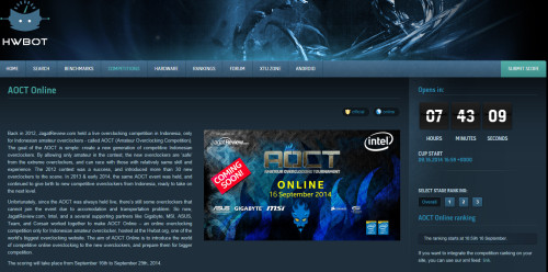 Update 16/9/2014 18:00 WIB: Kami masih mencoba koordinasi dengan pihak Hwbot perihal timer waktu lomba, karena timer yang ada disana menggunakan GMT +0, bukan wilayah waktu GMT+7. Ada juga beberapa informasi di halaman ini yang belum di-update pada server hwbot(seperti wallpaper,dan ketentuan screenshot/foto). Mohon maaf untuk hal ini, akan segera kami perbaiki.