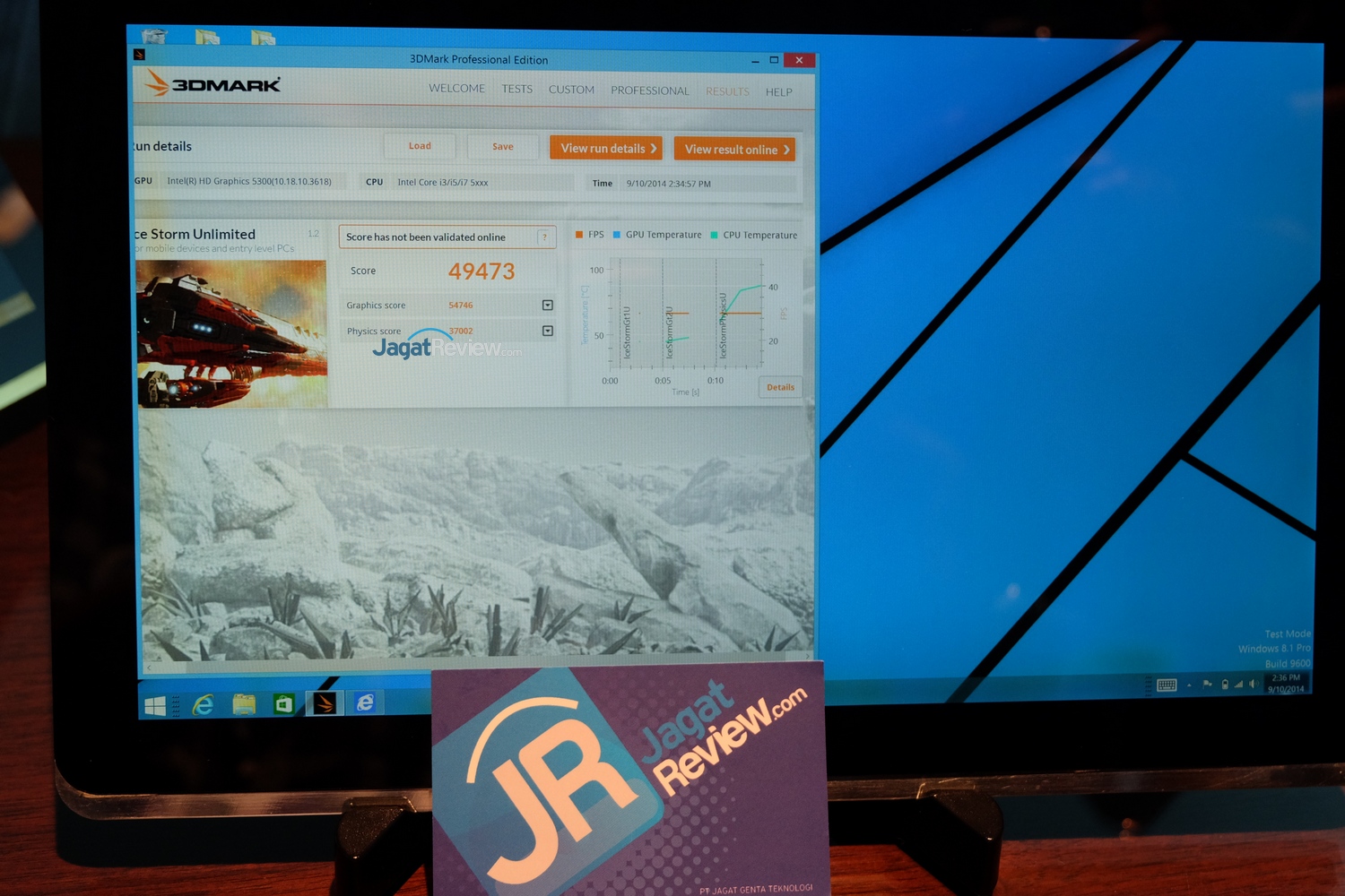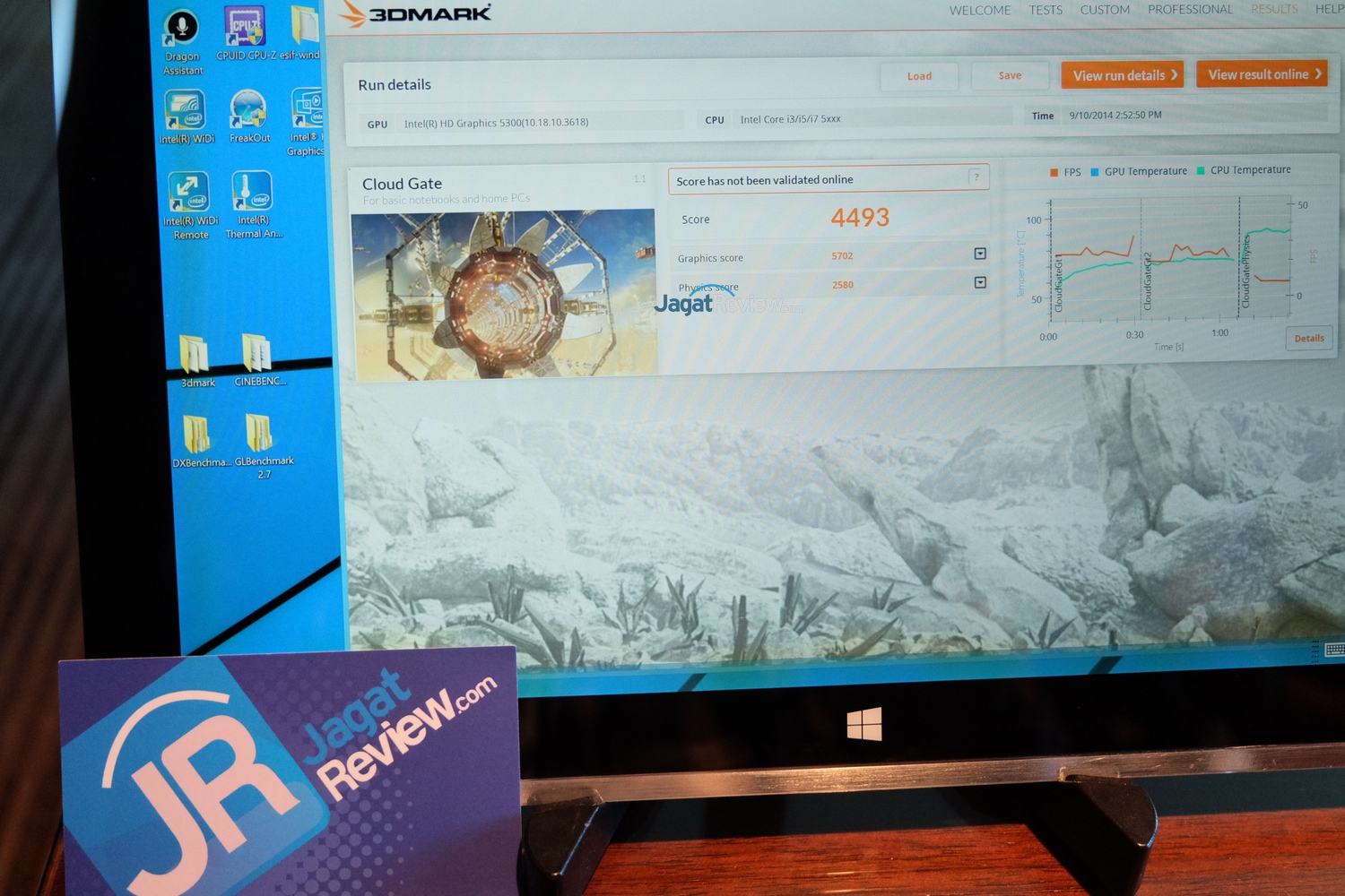 Sedikit “memaksakan”, kami menguji pula sebuah benchmark yang lebih berat yaitu 3DMark Cloud Gate. Paket benchmark yang ditujukan untuk sistem entry-level hingga kelas menengah ini menunjukkan nilai yang lagi-lagi tidak mengecewakan. Dengan skor overall di kisaran 4500, graphics score 5700, dan Physics score hampir mencapai 2600, menandakan bahwa Core M dalam wujud reference ini mampu bersaing dengan Core i3 atau bahkan Core i5 mobile di kelas Sandy Bridge dan Ivy Bridge.
