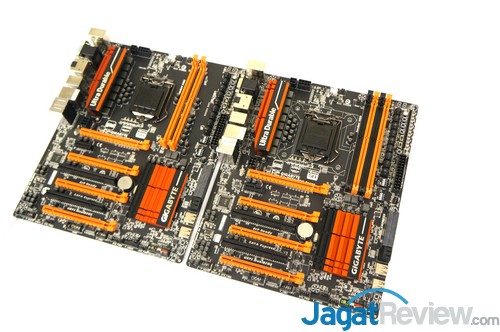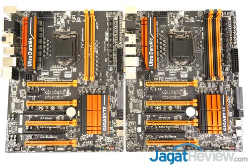 Terlihat, pada LN2 Edition, tidak terdapat mounting untuk heatsink. Yap, GIGABYTE SOC Force LN2 Edition memang tidak didesain untuk menggunakan heatsink, sehingga tidak memerlukan mounting tersebut, dan juga slot DIMM yang semula ada empat buah tersebut dikurangi menjadi dua buah, sehingga 2 buah slot memory yang terdapat disitu bisa digunakan semaksimal mungkin.