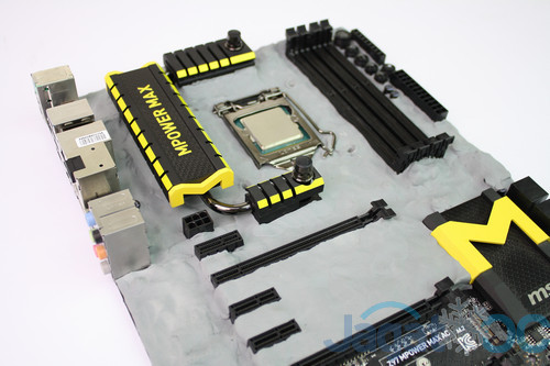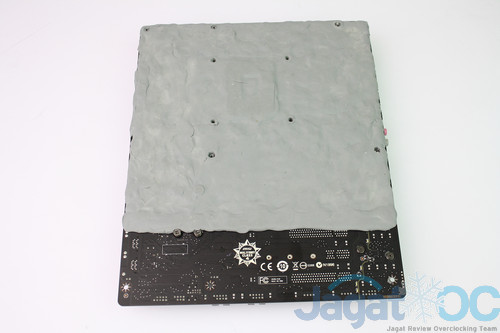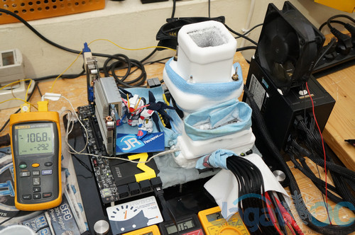 Setelah melapisi motherboard dengan kneaded eraser untuk mencegah kondensasi pada komponen, motherboard sudah siap diuji dengan pendingin ekstrim!
