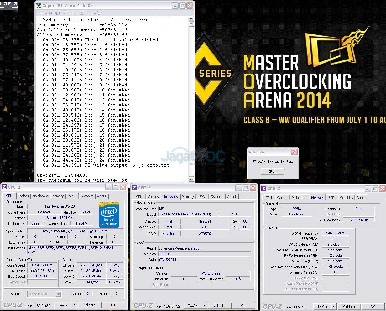 SuperPI 32M – G3258 @ 6264Mhz (1.99V VCore), DDR3-2922 9-12-12-17 1T – 4m 54.391s