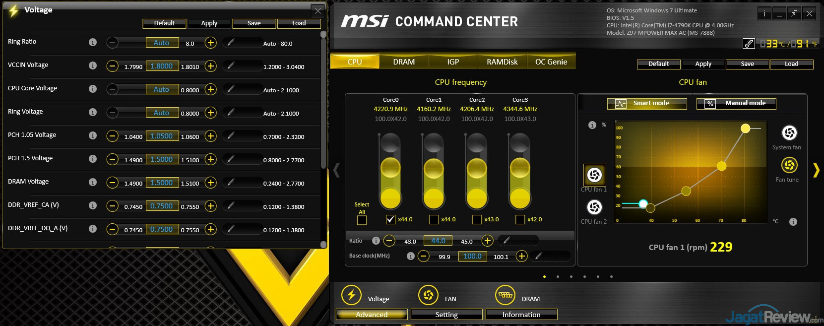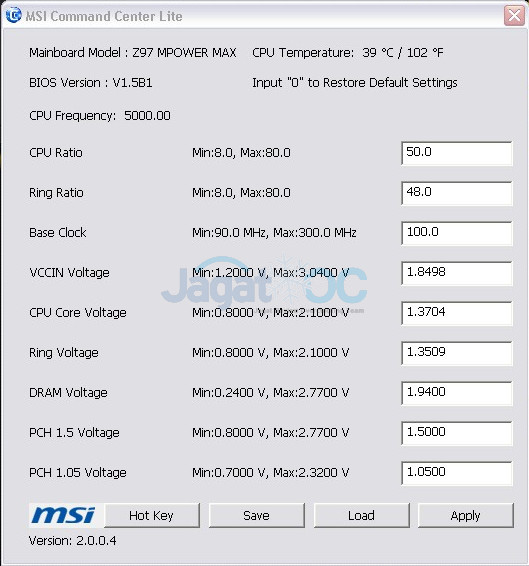 Bagi advanced/extreme overclocker yang menginginkan software untuk melakukan pengubahan parameter secara real-time di OS, namun menginginkan aplikasi yang ringan, MSI Menyediakan Command Center Lite. Disini, para overclocker bisa mengubah sekian banyak setting, mulai dari CPU Ratio, Ring Ratio, BCLK, dan Voltase, dengan hanya meng-inputnya melalui keyboard pada variabel yang diinginkan, lalu menekan ‘apply’. Tampilan dari Command Center Lite bisa dilihat dibawah ini: