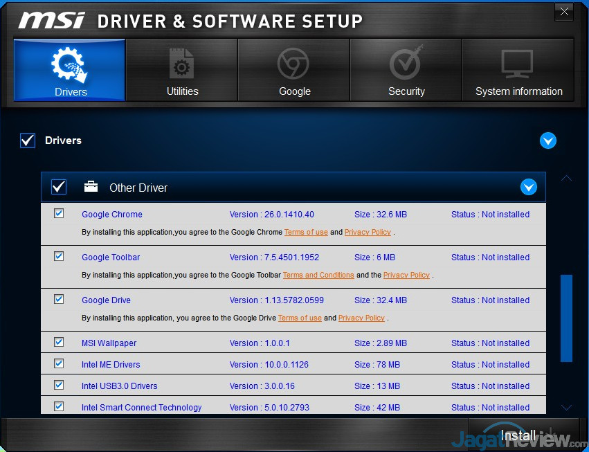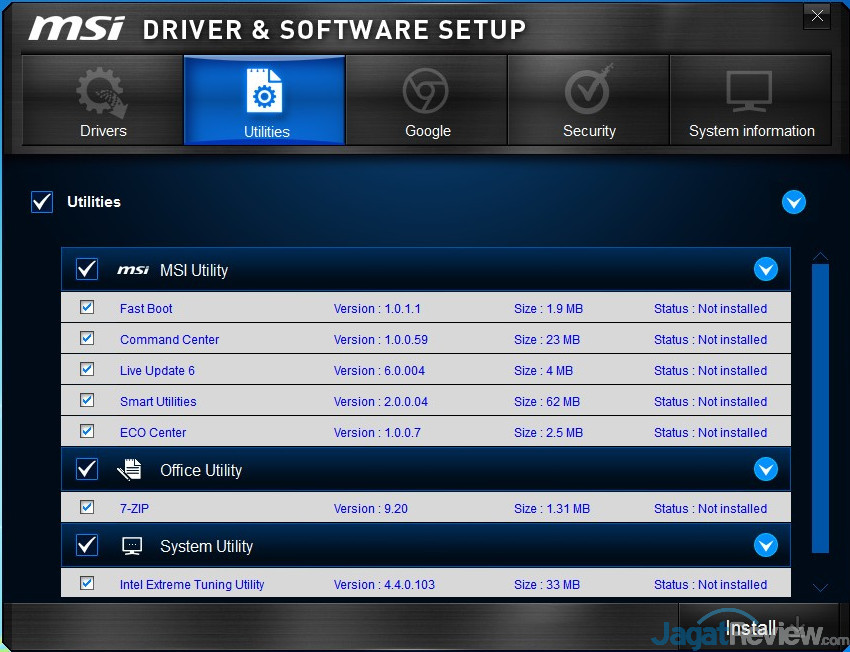 MSI memberikan sebuah langkah mudah bagi penggunanya saat melakukan instalasi software dan driver, yakni dengan cara memberikan sebuah all-in-one installer. Apa saja yang bisa diinstall bisa dilihat di bawah ini: