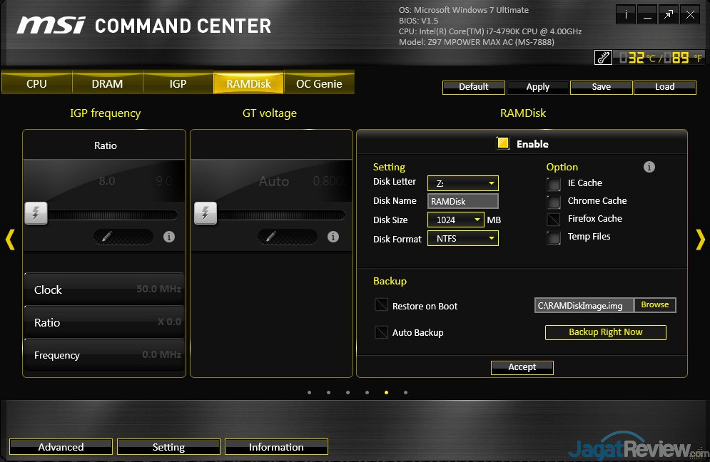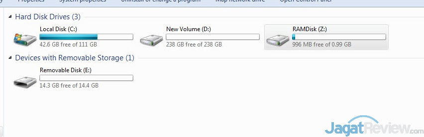 Utility Command Center juga bisa digunakan untuk membuat sebuah RAM Disk, yang akan mengalokasikan sejumlah memori sistem untuk dijadikan storage yang sangat cepat. Bagi anda yang membutuhkan sebuah temporary working drive untuk menyimpan file-file sementara, misalnya photoshop scratch disk, atau browser cache, RAM Disk ini bisa sedikit mempercepat kinerja sistem anda karena transfer rate-nya cukup tinggi.