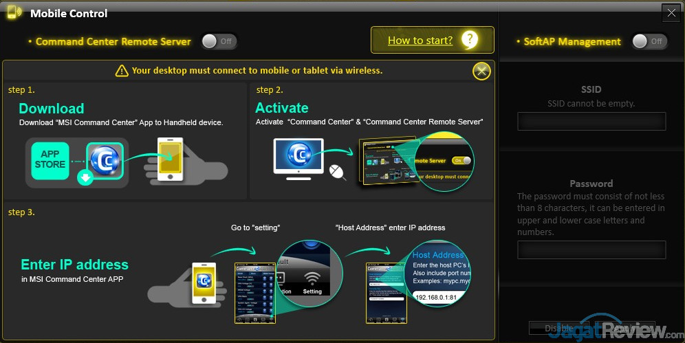 Ada lagi sebuah fitur ekstra yang disematkan dalam Command Center, yakni Command Center Remote Server, yang bisa mengatur/memonitor parameter sistem dari handheld mobile anda (android/iphone-based). Sayangnya meski aplikasi ini menarik, kadang-kadang masih agak susah mengkoneksikan perangkat smartphone anda dengan motherboard ini.