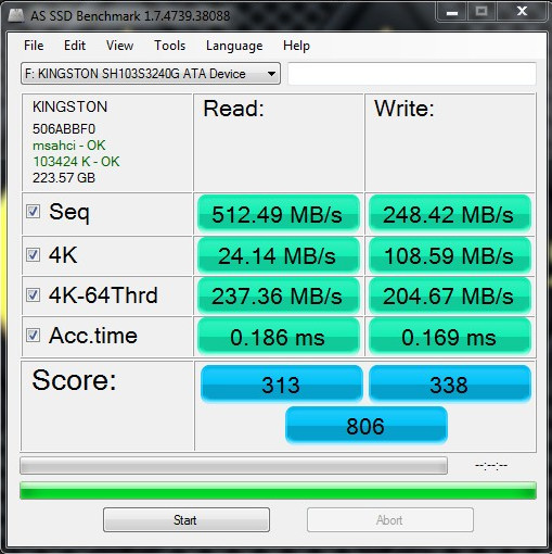 Sebagai perbandingan, di bawah ini skor AS SSD Benchmark dari Kingston HyperX 3K 240GB