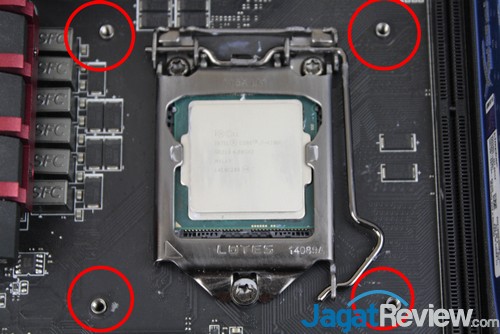 Sejajarkan keempat baut mounting dengan keempat lubang backplate yang sudah dipasang di motherboard tersebut.