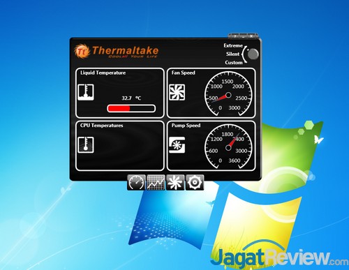 Halaman pertama memperlihatkan beberapa status seperti liquid temperature dan fan speed. Terdapat juga pilihan profile, extreme, silent, dan custom. Disini kami memilih profile extreme agar performa dari Water 3.0 Extreme ini maksimal.