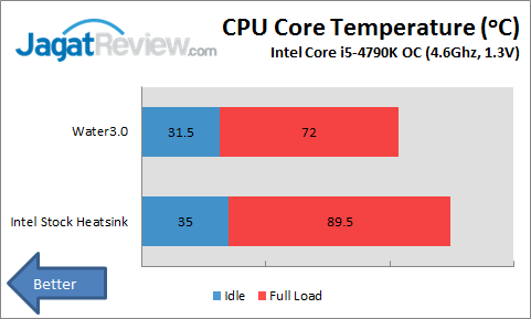 Pada kondisi OC 4,6 Ghz dengan voltase 1,3 V Thermaltake Water 3.0 Extreme ini mampu menahan suhu prosesor agar tidak menyentuh angka yang terlampau tinggi. Watercooling kit ini mampu meredam panas di kisaran 72°C yang perbedaanya sekitar 17°C dari Intel Stock Heatsink yang mendapatkan suhu kisaran hampir mencapai 90°C.