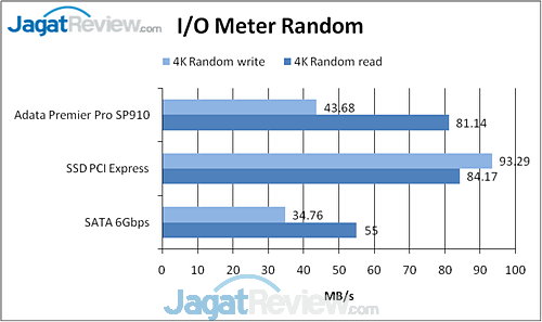 I/O Meter mendeteksi bahwa SSD ini memang masih lebih baik dibanding SSD SATA 6Gbps yang jadi pembanding. Bahkan, pada I/O Meter Random ADATA Premier Pro SP910 nyaris mendekati performa SSD PCI Express di 4K Random Read.
