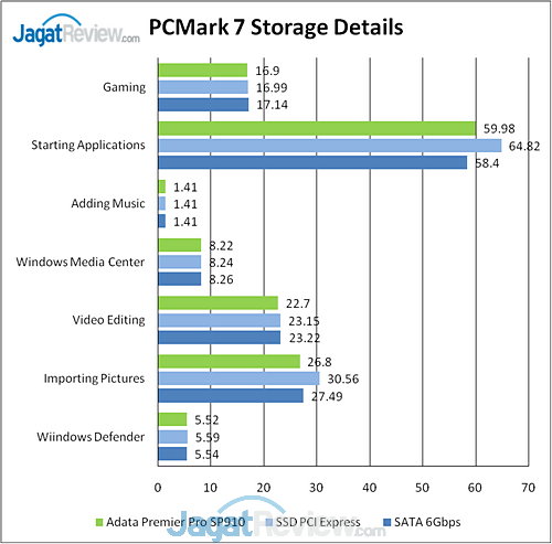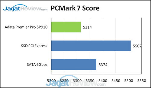 Pengujian PCMark 7 menunjukkan SP910 terkadang berada di bawah SSD SATA 6Gbps, walaupun perbedaannya tidak jauh.