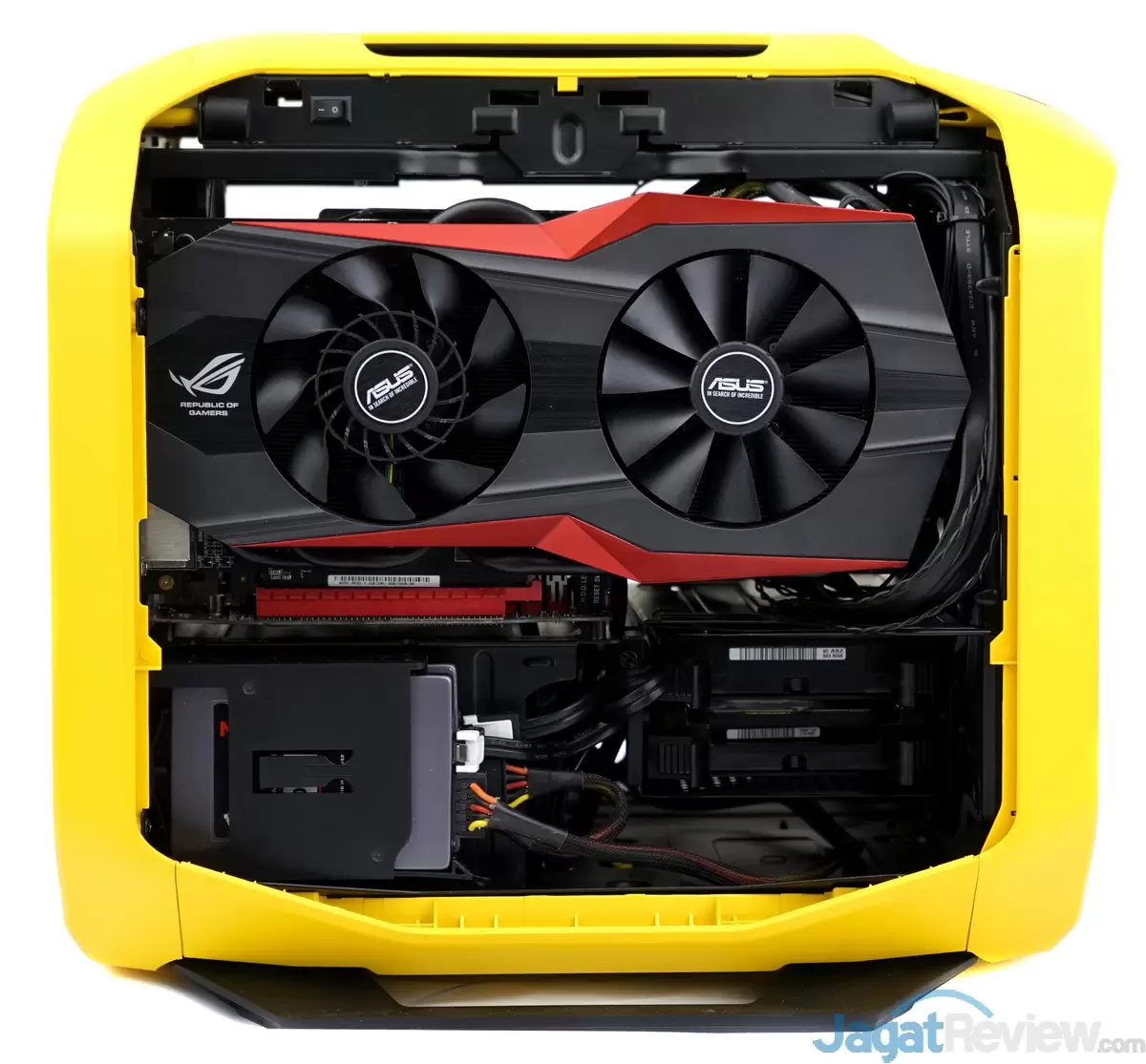 Pada pengujian casing Corsair Graphite 380T ini, kami berhasil memasang VGA card ASUS AMD Radeon R9 290X Matrix yang berukuran besar ke dalam casing ini. (Catatan: Kami tidak merekomedasikan penggunaan PSU 500 Watt untuk VGA Card ini)