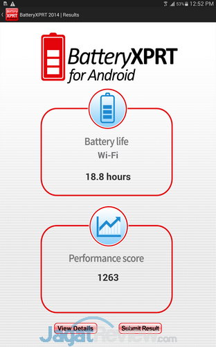 Samsung Galaxy Tab S dibekali baterai berkekuatan 7900mAh. Kami melakukan pengujian dengan memutar file video yang kami loop hingga baterai ini habis. Hasilnya, baterai tersebut mampu membuat perangkat ini menyala selama 12 jam 59 menit. Cukup memuaskan. Sementara pengujian menggunakan Battery XPRT Airplane mode with WiFi on, Galaxy Tab S mampu menghasilkan skor 1263 dengan estimasi umur baterai 18,8 jam.