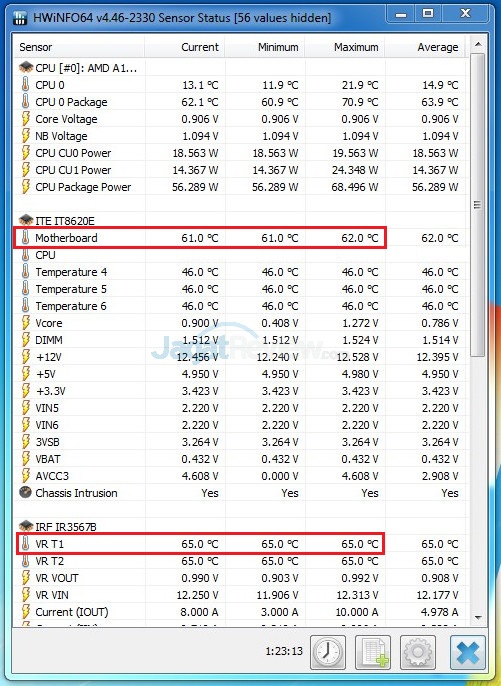 Perlu diketahui, pengukuran suhu prosesor pada AMD tidak terlalu akurat, sehingga kami melakukan estimasi suhu prosesor berdasarkan sensor pada program EasyTune 6 yang disertakan Gigabyte. Kami juga melakukan pengukuran suhu lain, seperti:
