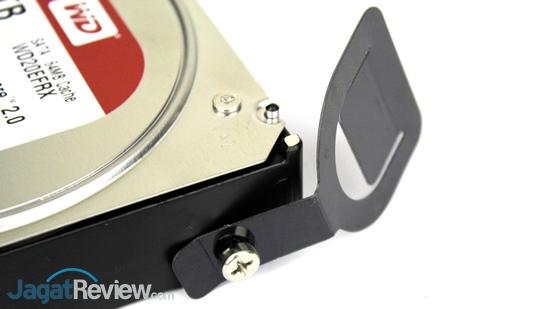 Untuk menarik harddisk yang terpasang, Anda bisa melakukannya melalui kait berbahan sejenis plastik lentur yang disediakan. Kait ini harus dipasang ke harddisk dengan menggunakan baut khusus yang juga berfungsi untuk memposisikan harddisk ke rel yang terdapat di dalam NAS agar harddisk masuk tepat mengarah ke konektor power dan SATA yang ada. Sayangnya, model pemasangan seperti ini menurut kami agak riskan. Selain itu, kait yang disediakan juga terasa agak ringkih.