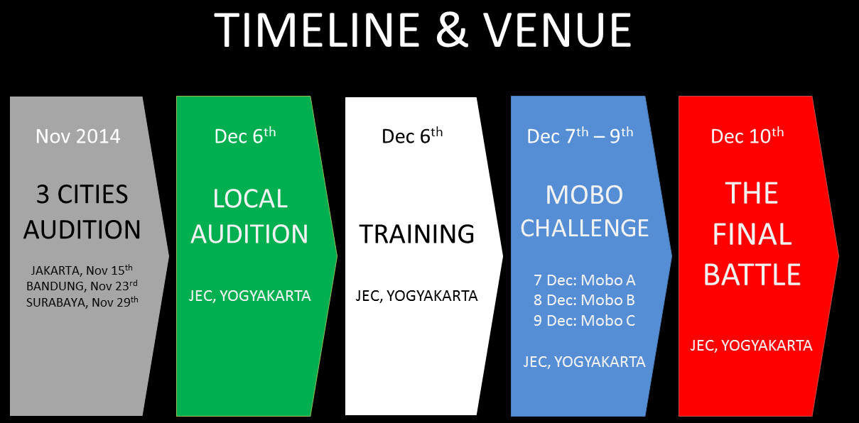 Walaupun begitu, rangkaian AOCT 2014 The Final Battle sendiri sebenarnya telah dimulai bulan November 2014 ini, yaitu untuk perebutan Silver Ticket. Untuk acara di Yogyakarta sendiri, Anda bisa melihat diagram di atas untuk melihat seperti apa tantangan yang harus dihadapai dalam AOCT 2014 The Final Battle.