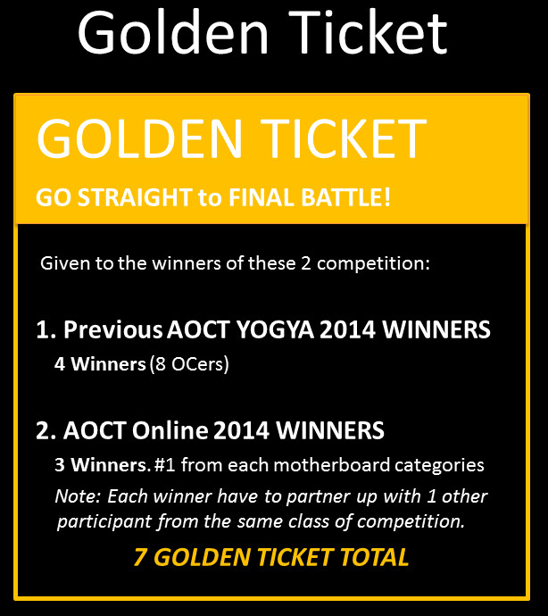 Panitia AOCT 2014 The Final Battle memberikan Golden Ticket, atau tiket langsung ke babak final, untuk 4 tim yang menjadi jawara AOCT 2014 Yogyakarta dan 3 jawara AOCT Online 2014, yang berarti mereka TIDAK PERLU mengikuti sesi Motherboard Challenge untuk meraih tiket ke “The Final Battle”. Berikut ini adalah mekanisme yang harus diikuti para jawara AOCT 2014 Yogyakarta dan AOCT Online 2014 untuk mengklaim Golden Ticket mereka: