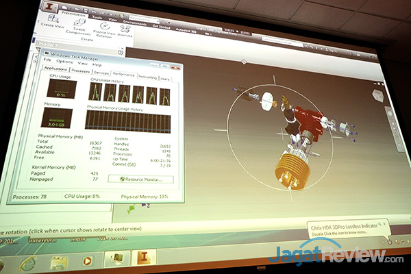 Di akhir pemaparan mengenai virtual workstation, Dell menampilkan sebuah demo worsktation virtual. Dalam demo tersebut, sebuah notebook biasa menjalankan software AutoCAD dengan desain yang cukup rumit melalui virtualisasi. Jadi, semua pekerjaan dilakukan di-server sementara notebook berfungsi untuk menampilkan dan mengendalikan saja.