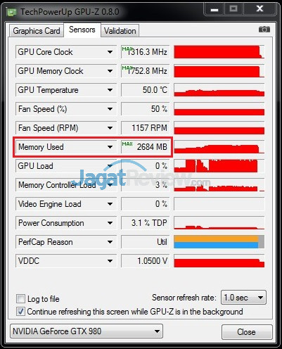 Berikut ini konsumsi video RAMnya, pada sebuah GTX 980 4GB yang kami punya: