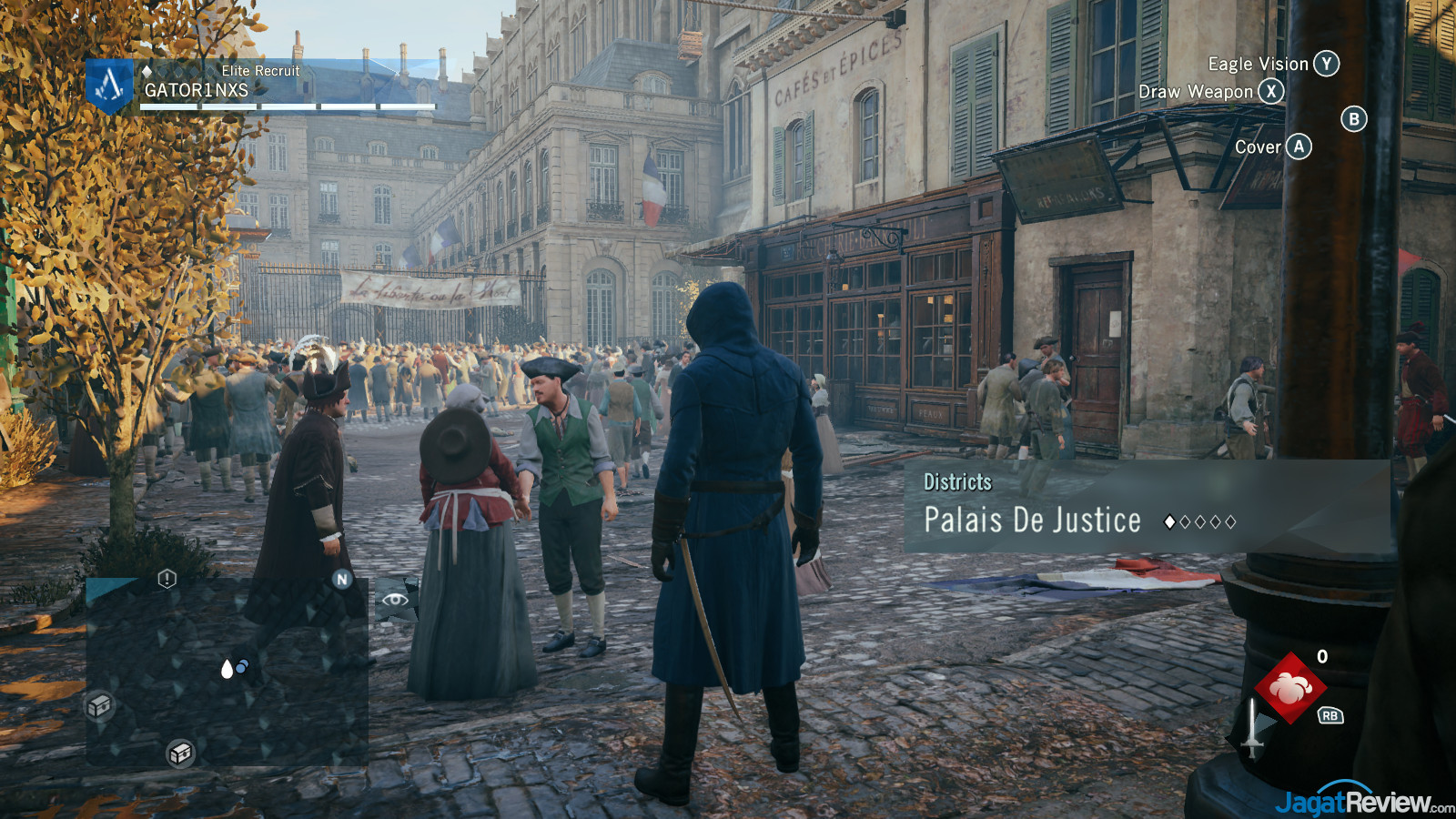 AC Unity tidak memiliki sebuah tool benchmark terintegrasi, untuk itu kami memilih sebuah scene pada Sequence 1 Memory 3 yang memiliki banyak NPC, lalu berlari sekitar 60 detik sambil merekam tingkat FPS dengan tool FRAPS (lalu diulang lima kali untuk mengambil rata-rata), untuk melihat seberapa jauh beban game ini kepada CPU dan GPU. Berikut ini beberapa screenshot dari scene benchmark yang kami lakukan: