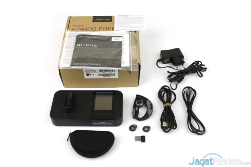 Di dalam pouch terdapat dua ekstra ear gel tips dan sebuah receiver USB Jabra Link 360 untuk menyambungkan headset ini dengan PC ataupun Mac.