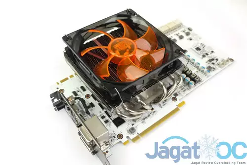 Galaxy GTX 780 Ti HOF V2 datang dengan sebuah waterblock custom dari EK Water Blocks, namun karena pada saat pengujian lab kami tidak dilengkapi dengan perlengkapan watercooling lainnya(reservoir, radiator, pump, etc). Kami memutuskan untuk melakukan pengujian dengan sebuah aircooling yang masih kompatibel, yakni PCCooler K120E VGA Cooler.