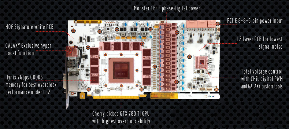 Kata HOF pada nama VGA Card ini adalah singkatan dari ‘Hall-of-Fame’. Dan kata tersebutlah yang menjadi inspirasi utama pembuatan kartu grafis Galaxy HOF, yakni menciptakan kartu grafis dengan spesifikasi settinggi mungkin untuk mendapat performa tertinggi dan memecahkan rekor benchmark. Galaxy sendiri mengatakan bahwa ‘The Galaxy GeForce GTX 780 Ti HOF V2, developed in co-operation with renowned overclocker Mad222, was designed with a single reason in mind: To create the fastest graphics card on the planet“. Untuk itu, Galaxy melengkapi kartu grafis tersebut dengan komponen berkualitas premium, dan juga menyertakan sebuah custom-made watterblock dari EK Water Blocks untuk menjaga suhunya.