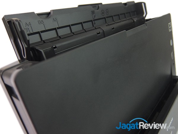 Paper tray yang dapat dibuka atau ditutup berada di bagian atas scanner, di mana kertas akan turun dan masuk ke dalam scanner dan akan keluar pada tray bagian bawah (bagian feeding) scanner yang berbentuk mirip huruf J.Paper tray mampu menampung kertas hingga maksimal 30 lembar yang mampu memindai kertas hingga ukuran Letter.