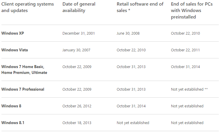 Adapun di bagian bawah, Microsoft memberikan keterangan yang berkaitan dengan Windows 7 Professional, dimana Microsoft akan memberikan peringatan jika akan dihentikannya versi tersebut satu tahun sebelumnya. Jika Microsoft belum mengupdate tabel tersebut dengan tanggal baru maka bisa dikatakan bahwa Windows 7 Professional tetap akan dijual hingga 31 Oktober 2015 atau bisa lebih lama lagi. Namun perlu diperhatikan bahwa Mainstream Support untuk Windows 7, yakni dukungan yang meliputi dukungan insiden gratis, klaim garansi, perbaikan untuk non-security termasuk security bugs perubahan desain dan permintaan fitur, termasuk Windows 7 Professional akan berakhir lebih cepat dibanding masa penjualannya, yakni pada 13 Januari 2015 meski masih ada kemungkinan Microsoft akan memberikan perpanjangan dukungan. Perpanjangan dukungan sendiri hanya akan terdiri dari update sistem keamanan saja.