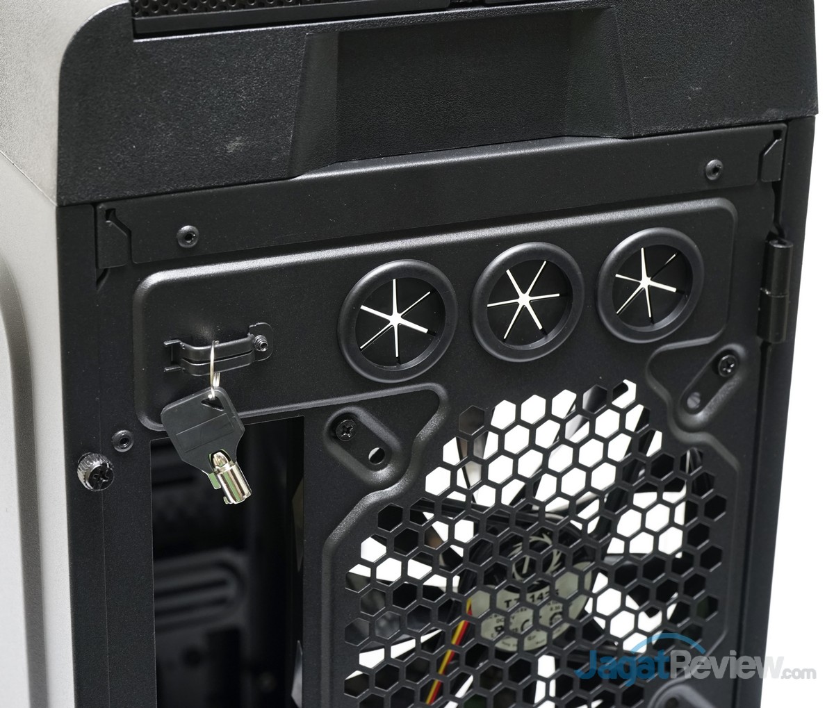 Urban T81 ini memiliki mekanisme pengunci untuk side-panel yang membutuhkan kunci khusus untuk membukanya. Kunci tersebut diletakkan di bagian belakang, dekat dengan lubang untuk watercooling.