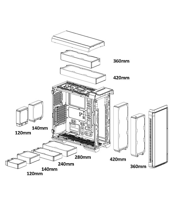 | Radiator Support | Front: 1 x 120mm or 1 x 240mm or 1 x 360mm 1 x 140mm or 1 x 280mm or 1 x 420mm Top: 1 x 120mm or 1 x 240mm or 1 x 360mm 1 x 140mm or 1 x 280mm or 1 x 420mm Rear: 1 x 120mm or 1 x 140mm Bottom: 1 x 120mm or 1 x 240mm 1 x 140mm or 1 x 280mm |